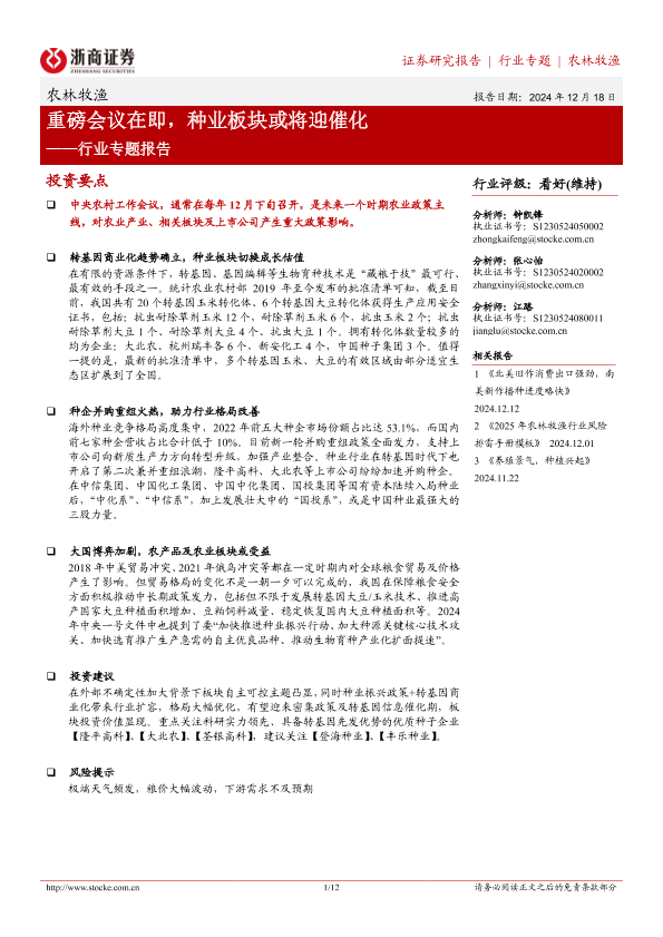 【浙商证券】【20241218】农林牧渔行业专题报告:重磅会议在即,种业板块或将迎催化-12页