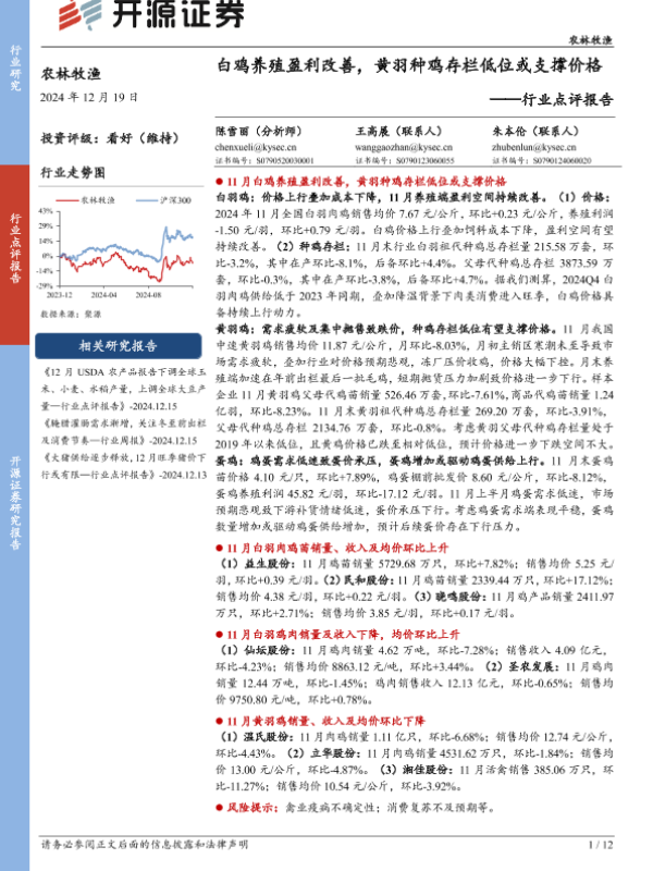 【开源证券】【20241219】农林牧渔行业点评报告:白鸡养殖盈利改善,黄羽种鸡存栏低位或支撑价格-12页