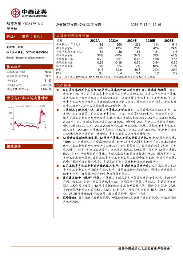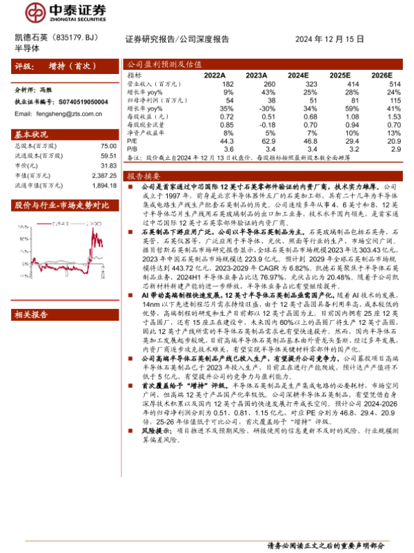【中泰证券】【20241215】凯德石英(835179)石英零部件领先企业,高端半导体产品有望打破国外垄断-17页