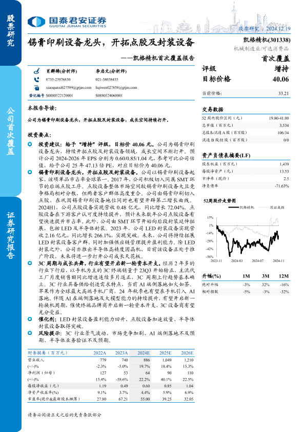 【国泰君安证券】【20241219】凯格精机(301338)首次覆盖报告:锡膏印刷设备龙头,开拓点胶及封装设备-25页