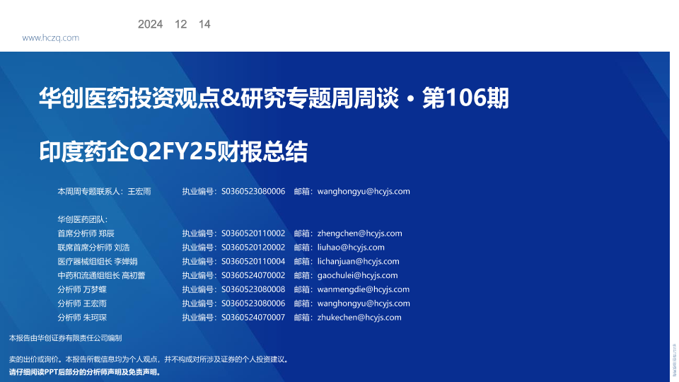 【华创证券】【20241214】医药行业投资观点&研究专题周周谈·第106期:印度药企Q2FY25财报总结-25页