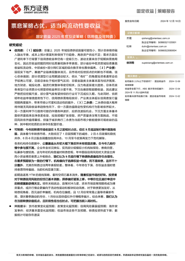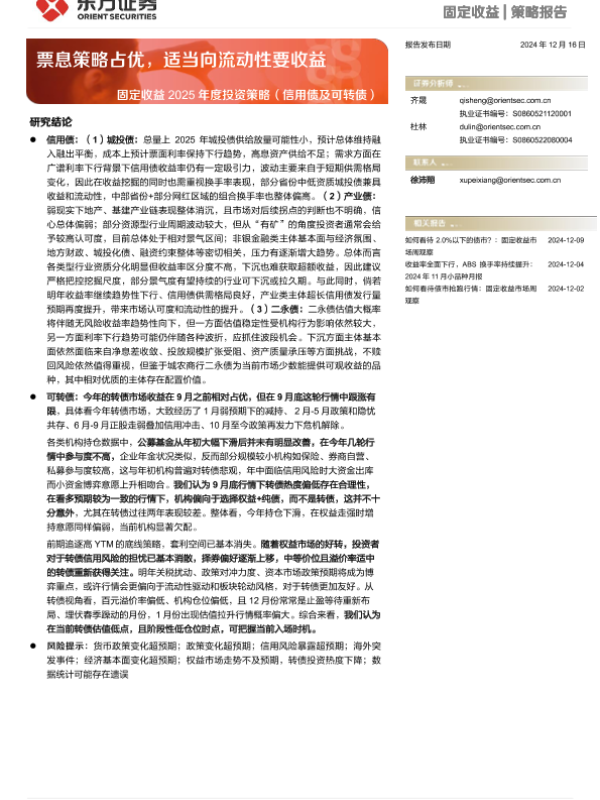 【东方证券】【20241216】固定收益2025年度投资策略(信用债及可转债):票息策略占优,适当向流动性要收益-38页