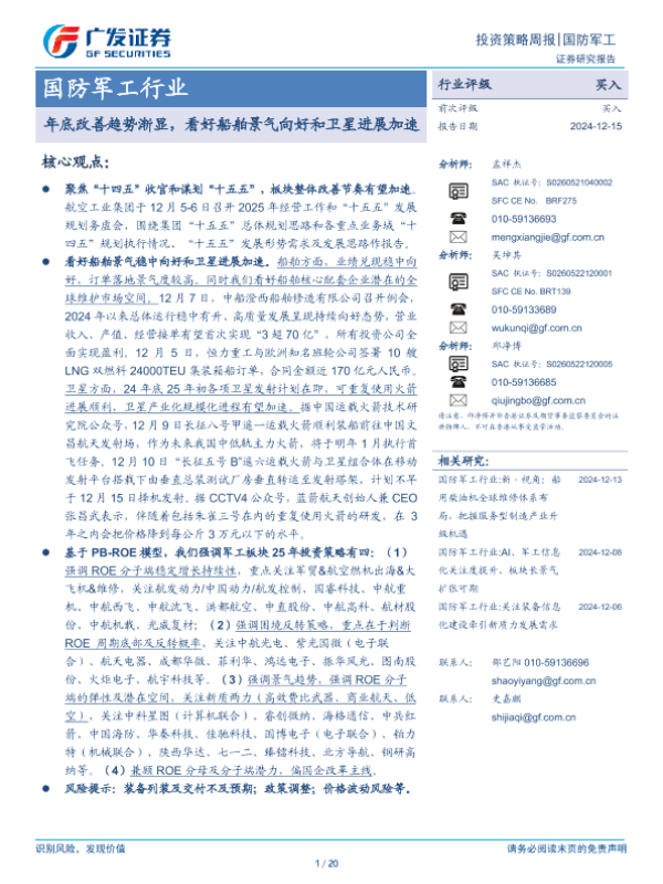 【广发证券】【20241215】国防军工行业:年底改善趋势渐显,看好船舶景气向好和卫星进展加速-20页