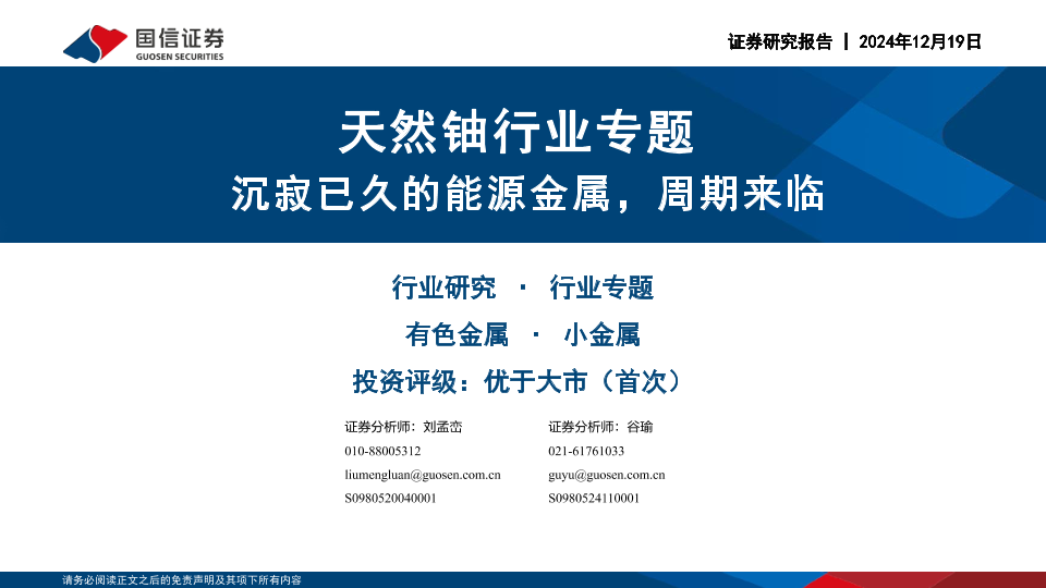 【国信证券】【20241219】天然铀行业专题:沉寂已久的能源金属,周期来临-47页