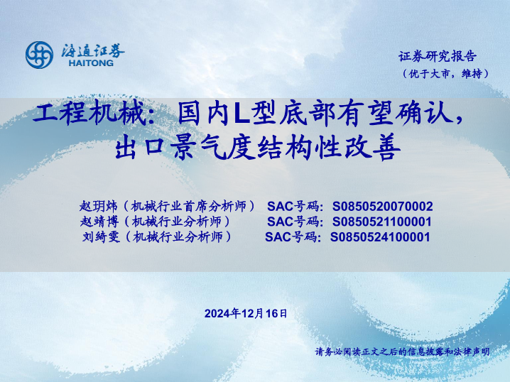 【海通证券】【20241216】工程机械行业:国内L型底部有望确认,出口景气度结构性改善-24页