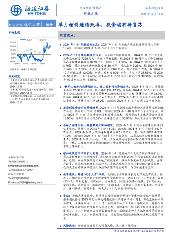 【海通证券】【20241217】房地产行业月报:单月销售连续改善,投资端有待复苏-12页