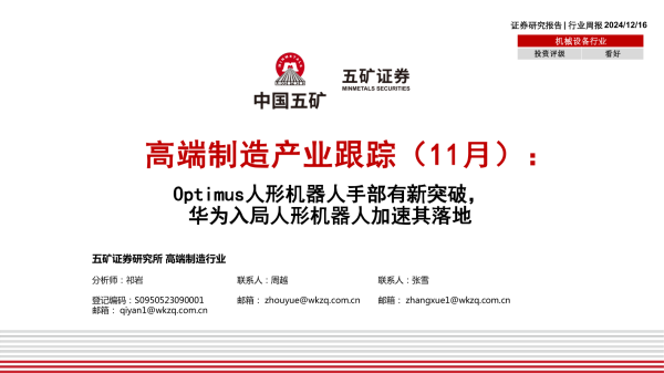 【五矿证券】【20241216】机械设备行业高端制造产业跟踪(11月):Optimus人形机器人手部有新突破,华为入局人形机器人加速其落地-30页