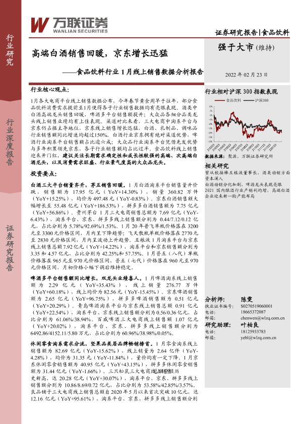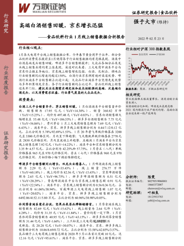 【万联证券】【20220223】食品饮料行业1月线上销售数据分析报告:高端白酒销售回暖,京东增长迅猛-21页