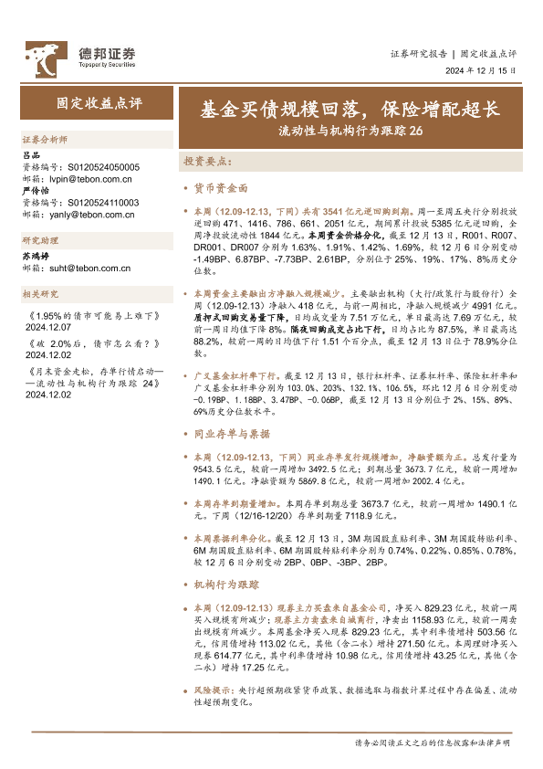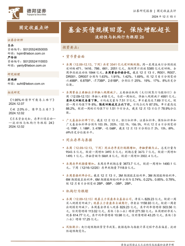 【德邦证券】【20241215】流动性与机构行为跟踪26:基金买债规模回落,保险增配超长-18页