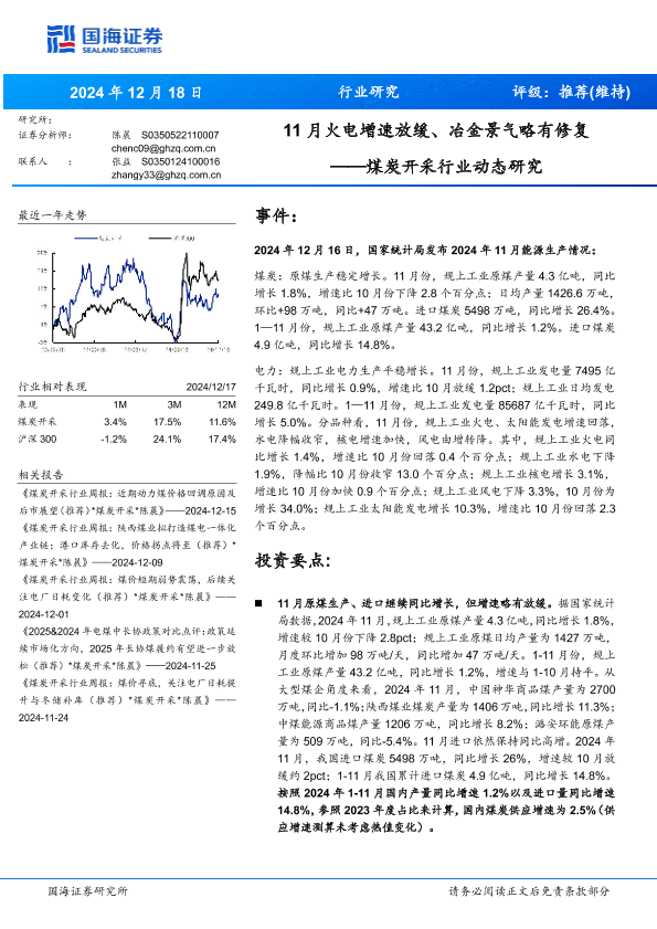 【国海证券】【20241218】煤炭开采行业动态研究:11月火电增速放缓、冶金景气略有修复-20页