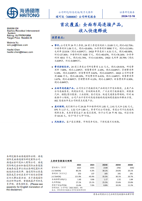 【海通国际】【20241216】瑞可达(688800)首次覆盖:全面布局连接产品,收入快速释放-12页