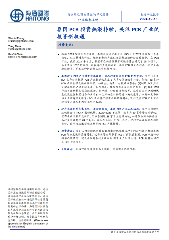 【海通国际】【20241218】电子元器件行业信息点评:泰国PCB投资热潮持续,关注PCB产业链投资新机遇-10页