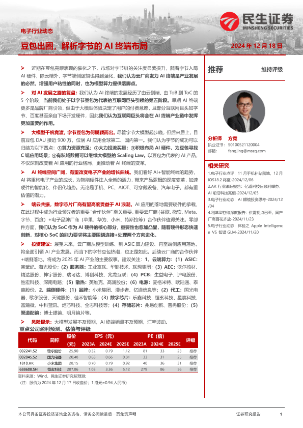 【民生证券】【20241218】电子行业动态:豆包出圈,解析字节的AI终端布局-16页