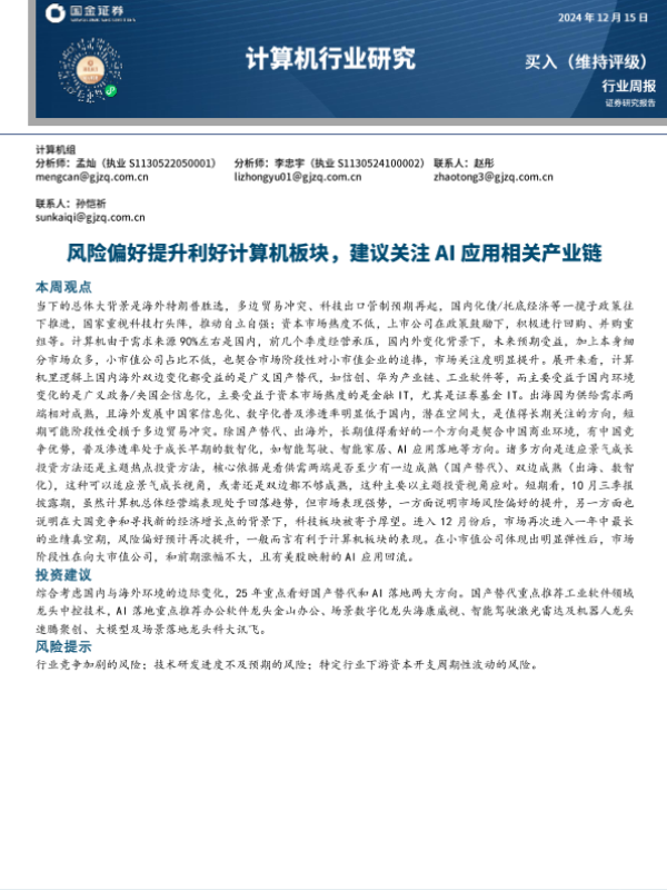 【国金证券】【20241215】计算机行业研究:风险偏好提升利好计算机板块,建议关注AI应用相关产业链-14页