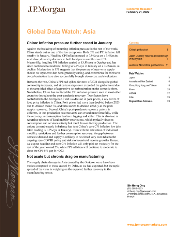 【J.P. Morgan】【20220221】J.P. 摩根-亚太地区投资策略-中国:1月份通胀压力进一步缓解-32页