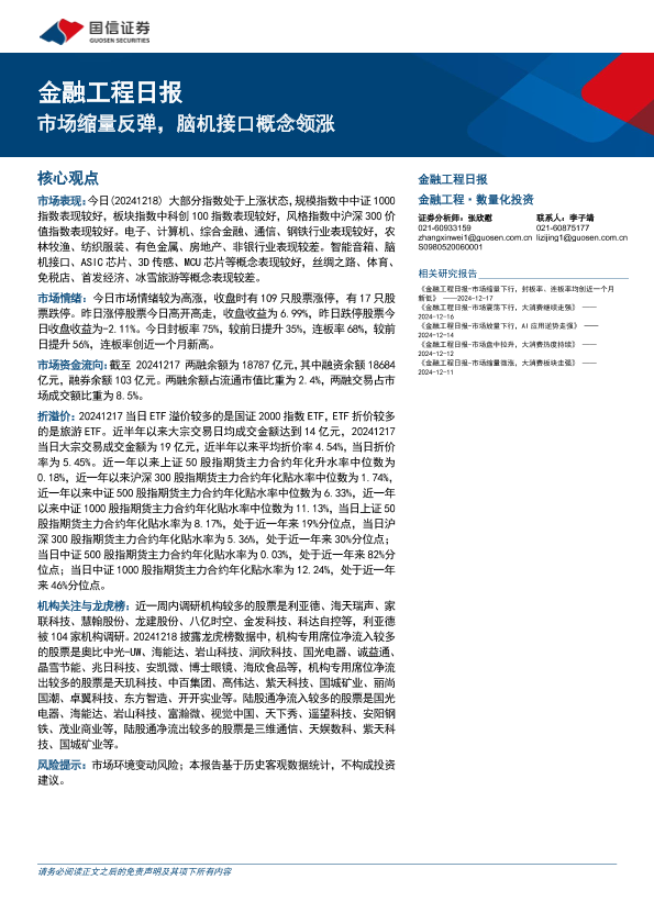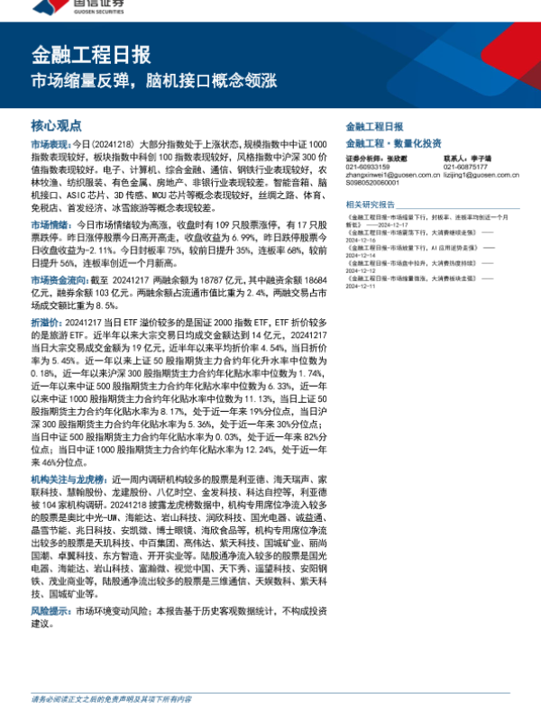 【国信证券】【20241218】金融工程:市场缩量反弹,脑机接口概念领涨-15页