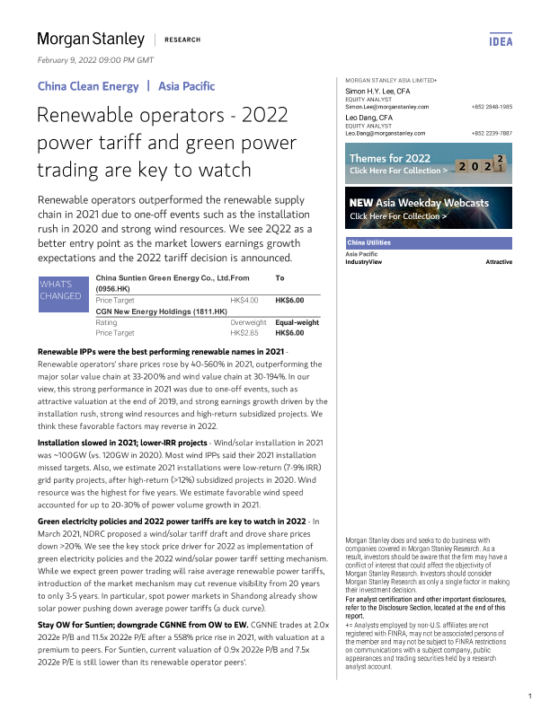 【Morgan Stanley】【20220209】中国清洁能源行业-可再生能源运营商:2022年电价和绿色电力交易是关注的关键-34页