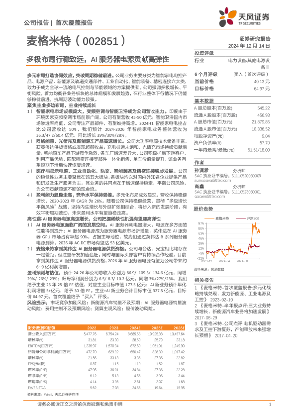 【天风证券】【20241214】麦格米特(002851)多极布局行稳致远,AI服务器电源贡献高弹性-41页