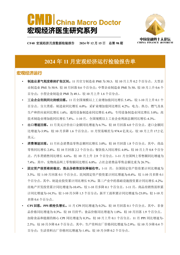 【中国金融四十人论坛(CF40)】【20241215】2024年11月宏观经济运行检验报告单-6页
