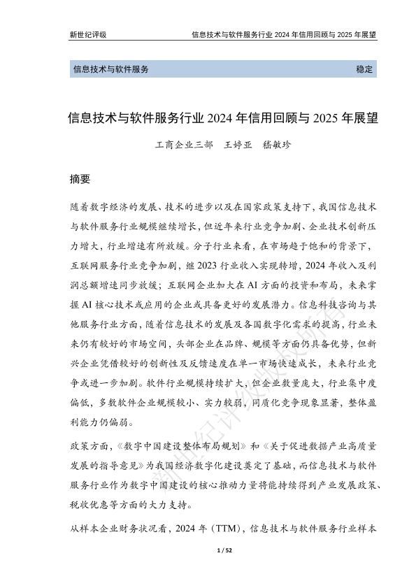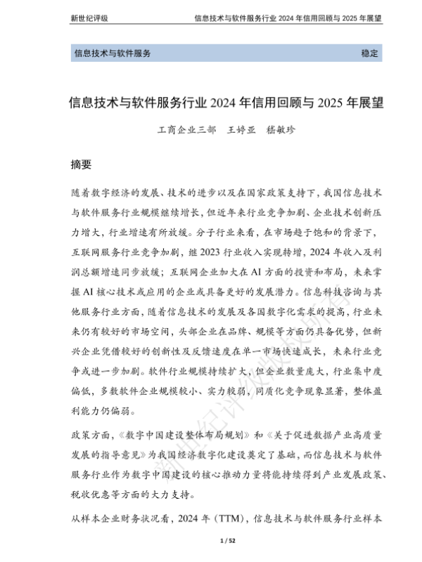 【新世纪评级】【2024】信息技术与软件服务行业2024年信用回顾与2025年展望-52页