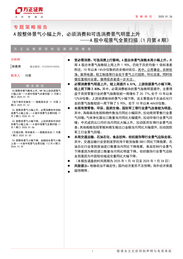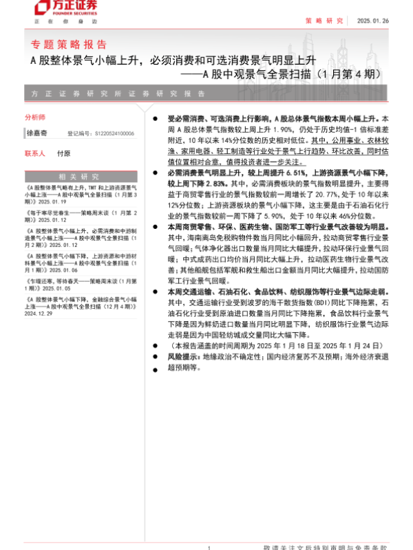 【方正证券】【20250126】A股中观景气全景扫描(1月第4期):A股整体景气小幅上升,必须消费和可选消费景气明显上升-24页