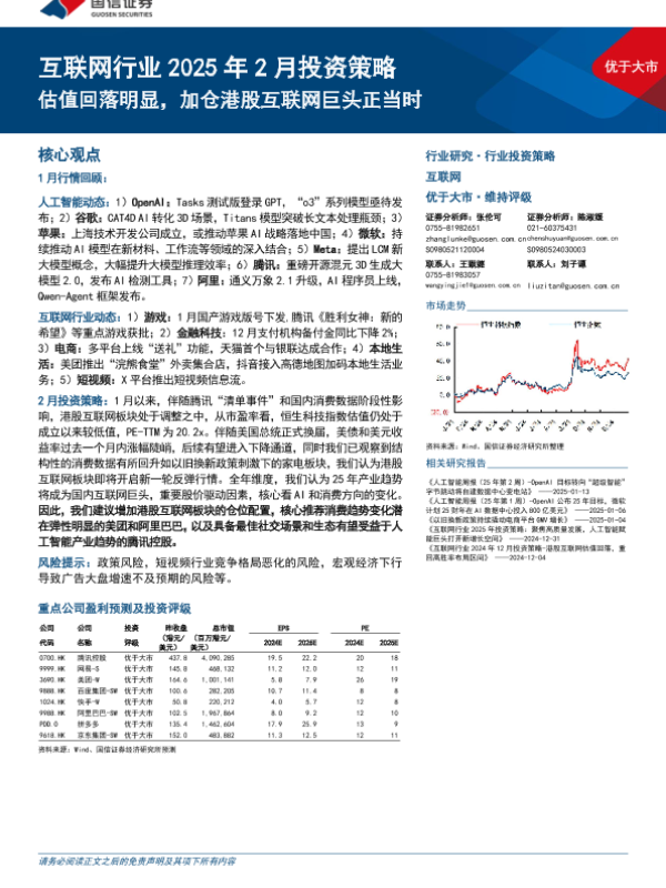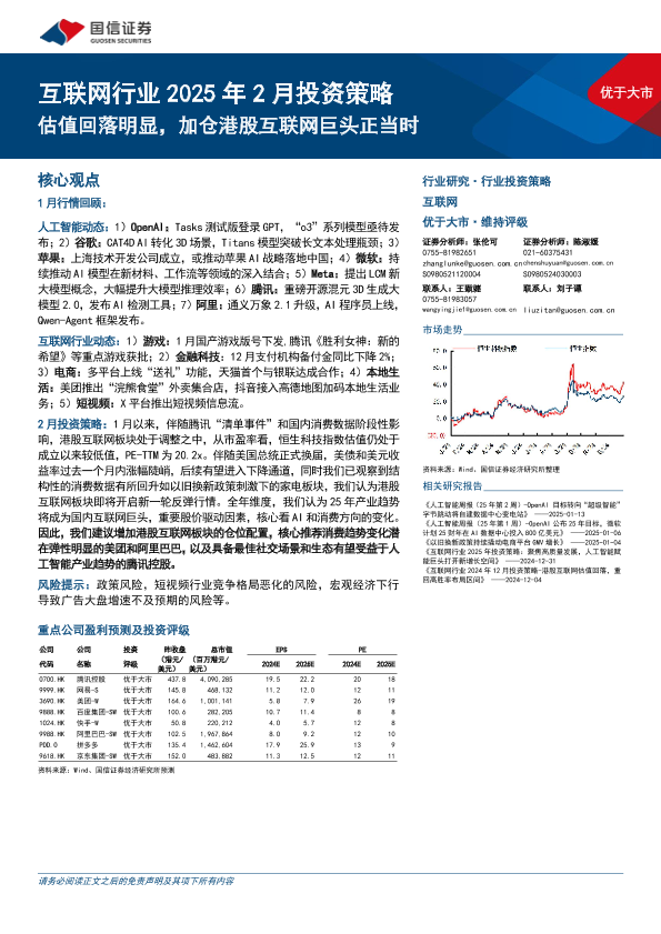 【国信证券】【20250124】互联网行业2025年2月投资策略:估值回落明显,加仓港股互联网巨头正当时-19页