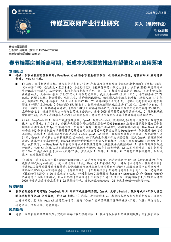 【国金证券】【202502】传媒互联网产业行业研究:春节档票房创新高可期,低成本大模型的推出有望催化AI应用落地-10页
