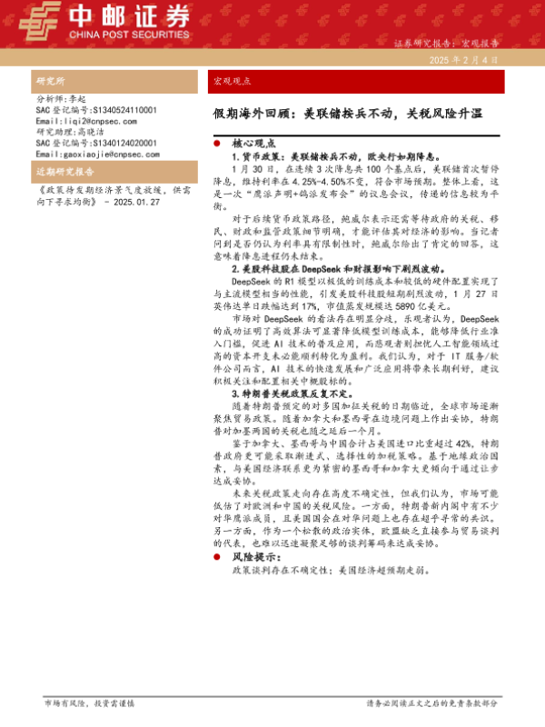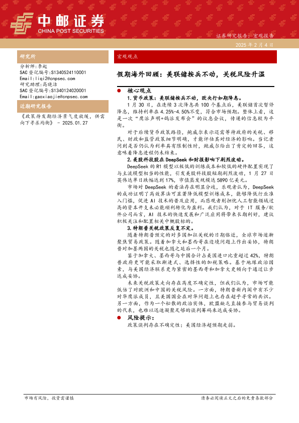 【中邮证券】【20250204】假期海外回顾:美联储按兵不动,关税风险升温-13页