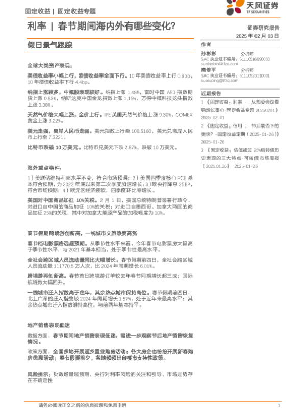 【天风证券】【20250203】假日景气跟踪:利率-春节期间海内外有哪些变化?-12页