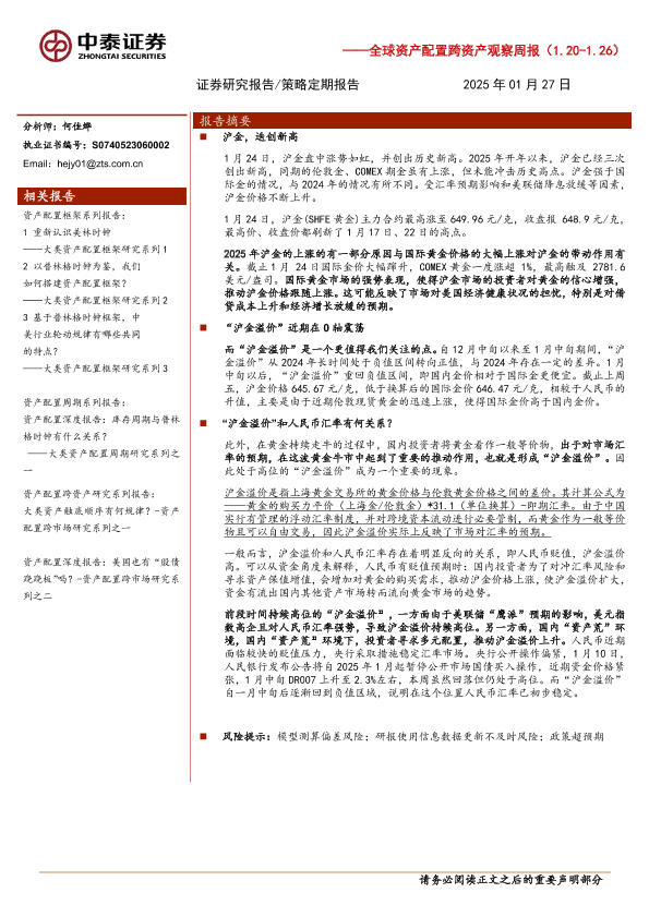 【中泰证券】【20250127】全球资产配置跨资产观察周报:从“沪金溢价”波动的视角看人民币汇率-18页