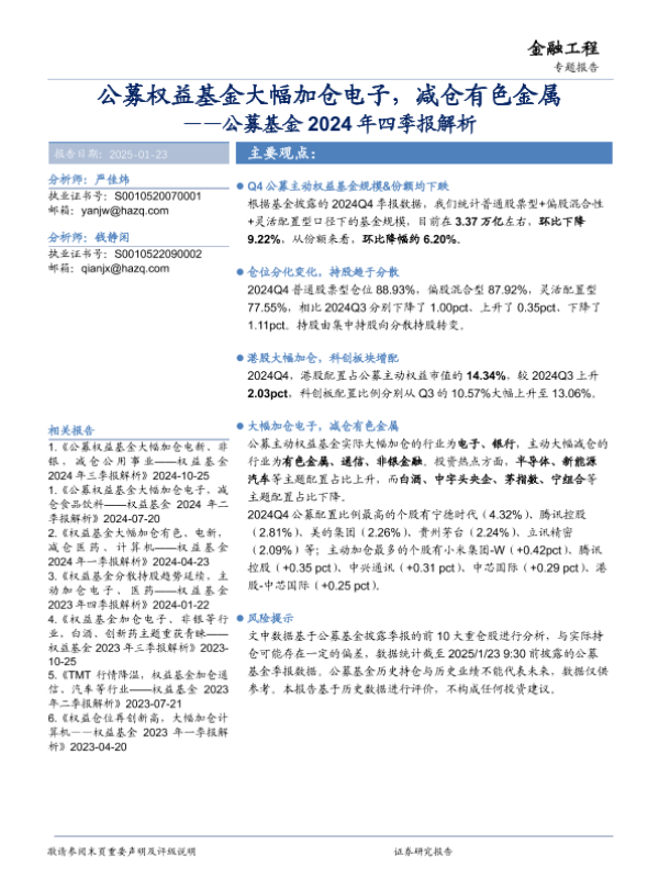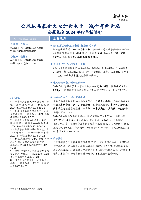 【华安证券】【20250123】公募基金2024年四季报解析:公募权益基金大幅加仓电子,减仓有色金属-18页