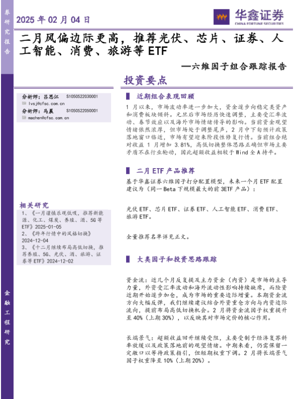 【华鑫证券】【20250204】六维因子组合跟踪报告:二月风偏边际更高,推荐光伏、芯片、证券、人工智能、消费、旅游等ETF-17页
