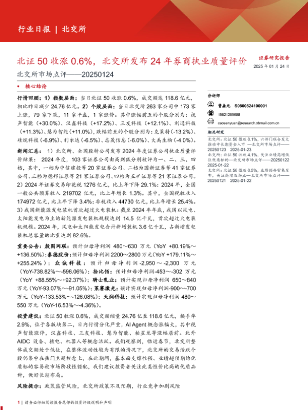 【西部证券】【20250124】北交所市场点评:北证50收涨0.6%25,北交所发布24年券商执业质量评价-11页