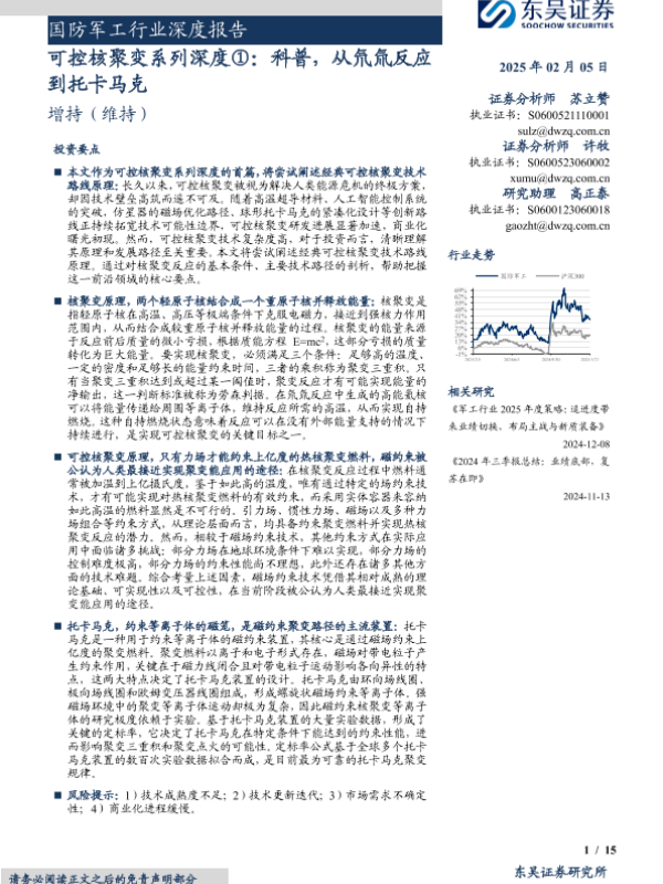 【东吴证券】【20250205】国防军工行业深度报告:可控核聚变系列深度①,科普,从氘氚反应到托卡马克-15页