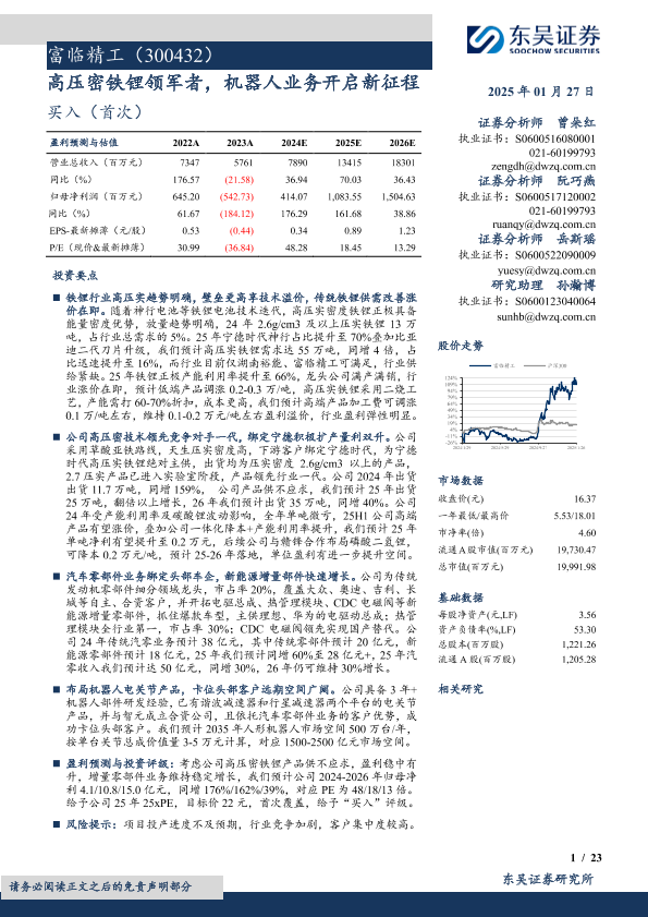 【东吴证券】【20250127】富临精工(300432)高压密铁锂领军者,机器人业务开启新征程-23页