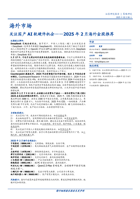 【国盛证券】【20250206】海外市场2025年2月海外金股推荐:关注国产AI软硬件机会-18页