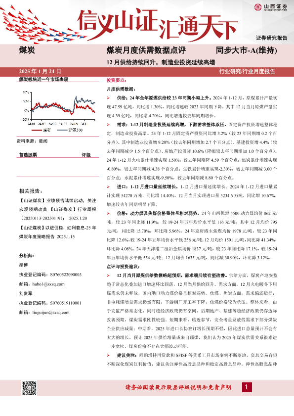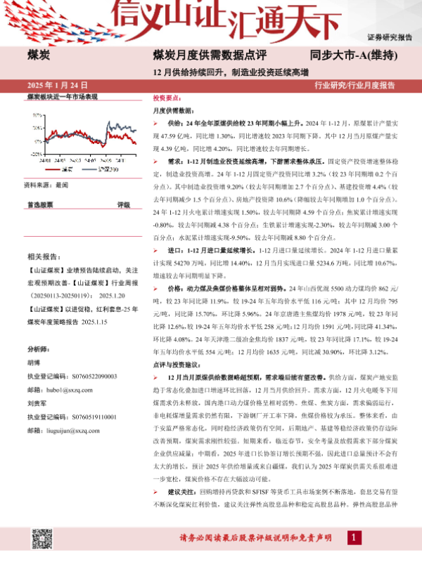 【山西证券】【20250124】煤炭行业月度供需数据点评:12月供给持续回升,制造业投资延续高增-12页