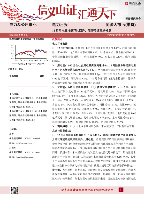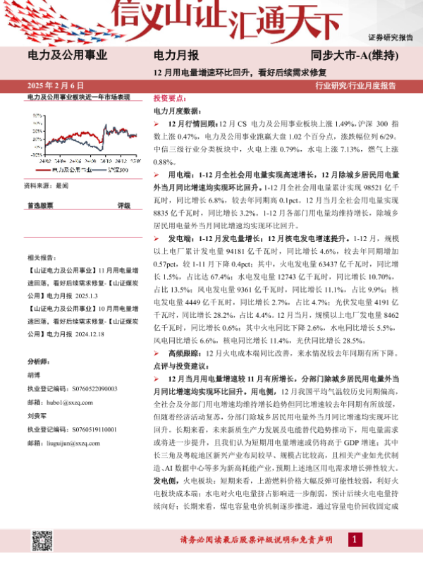 【山西证券】【20250206】电力及公用事业行业电力月报:12月用电量增速环比回升,看好后续需求修复-18页