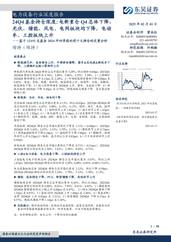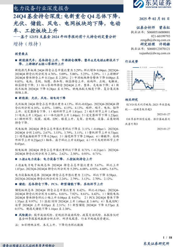 【东吴证券】【20250201】电力设备行业深度报告-24Q4基金持仓深度:电新重仓Q4总体下降,光伏、储能、风电、电网板块均下降,电动车、工控板块上升-18页