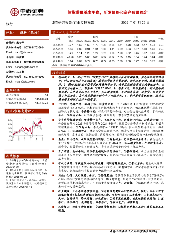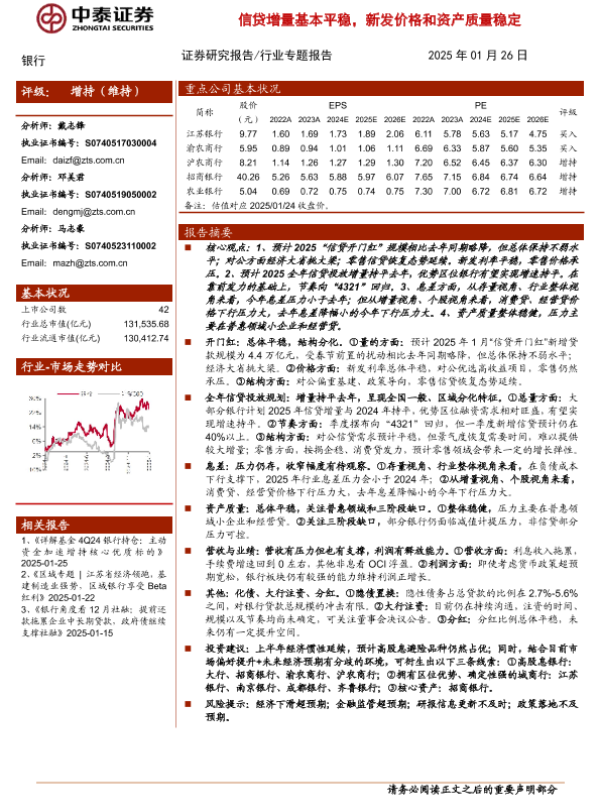 【中泰证券】【20250126】银行业2025年初最新跟踪:信贷增量基本平稳,新发价格和资产质量稳定-27页