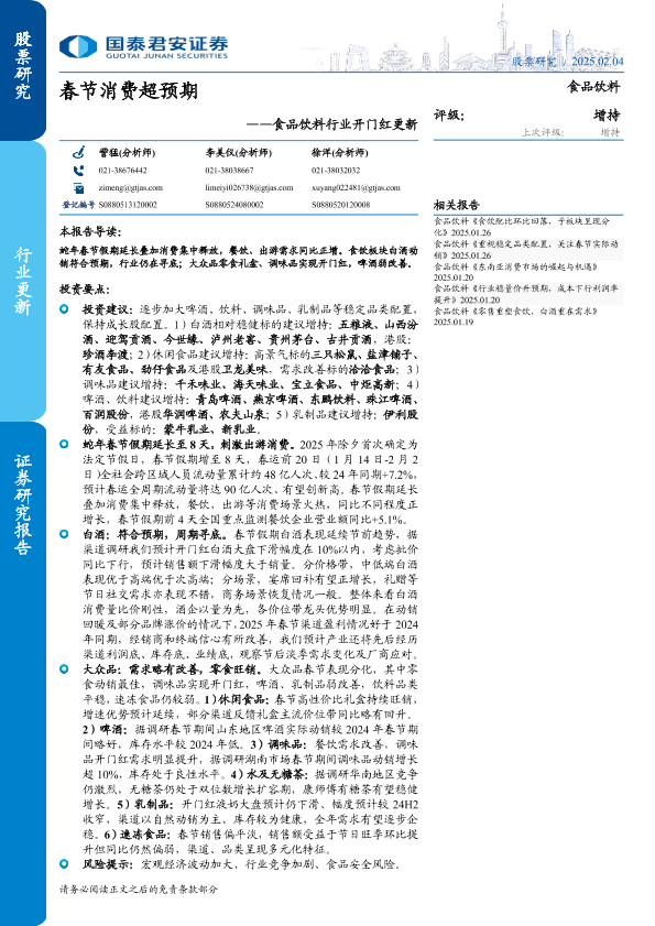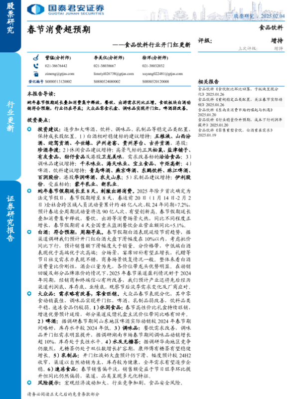 【国泰君安证券】【20250204】食品饮料行业开门红更新:春节消费超预期-14页