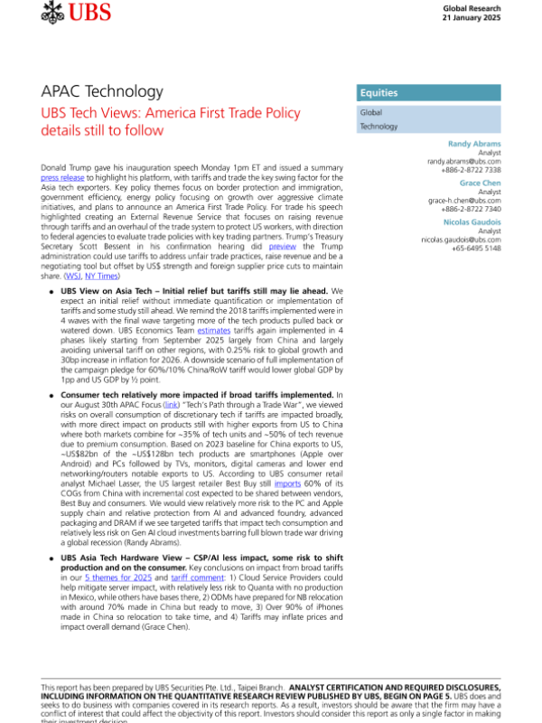 【UBS Securities Pte. Ltd.】【20250121】UBS Tech Views America First Trade Policy details still to follow-13页