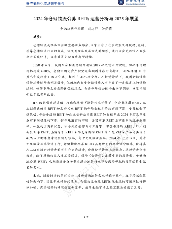 【金融结构评级部】【2024】2024年仓储物流公募REITs运营分析与2025年展望-21页