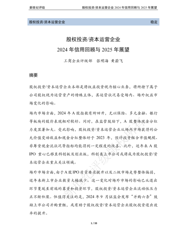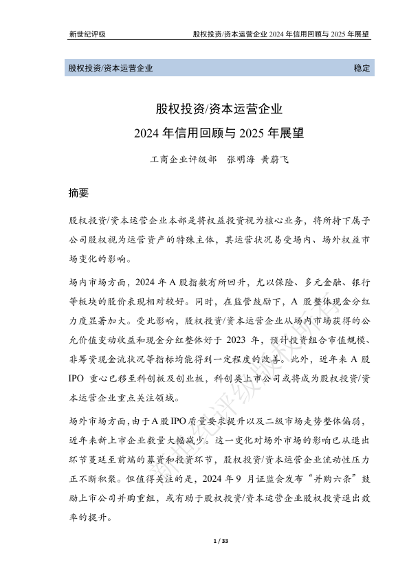 【新世纪评级】【2024】股权投资资本运营企业2024年信用回顾与2025年展望-33页