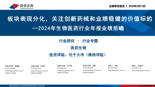 【国信证券】【20250213】2024年生物医药行业年报业绩前瞻:板块表现分化,关注创新药械和业绩稳健的价值标的-20页