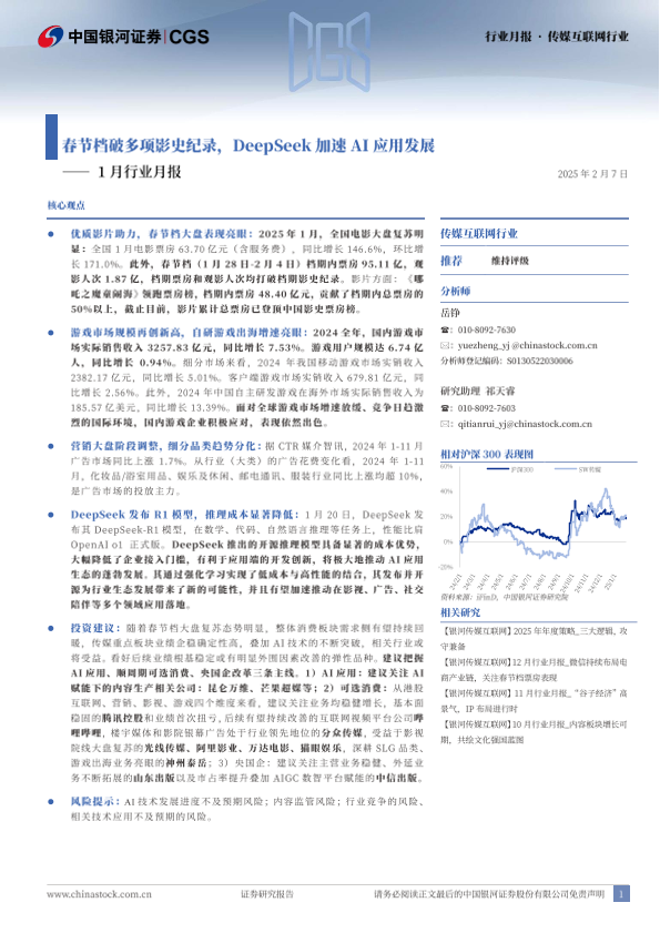 【银河证券】【20250207】传媒互联网行业1月行业月报:春节档破多项影史纪录,DeepSeek加速AI应用发展-30页