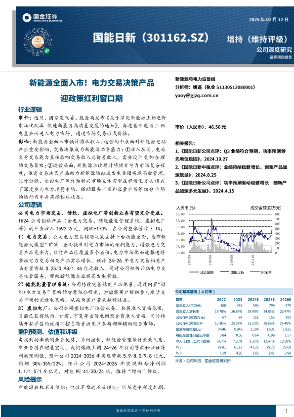 【国金证券】【20250212】国能日新(301162)新能源全面入市!电力交易决策产品迎政策红利窗口期-15页