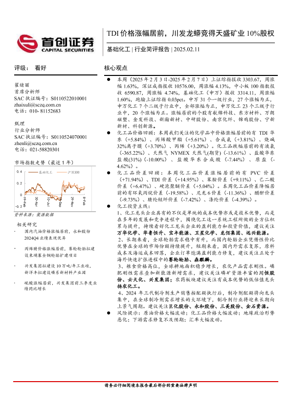 【首创证券】【20250211】基础化工行业简评报告:TDI价格涨幅居前,川发龙蟒竞得天盛矿业10%股权-16页