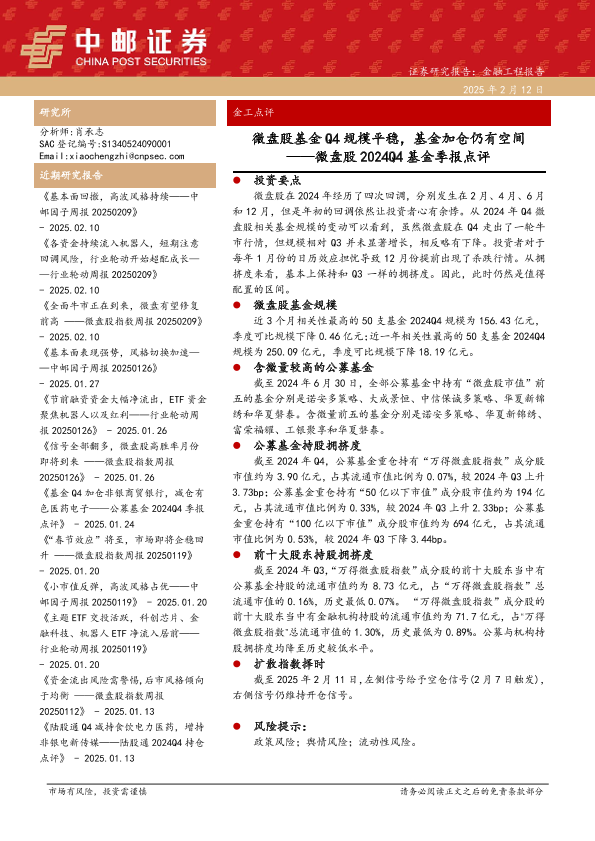 【中邮证券】【20250212】微盘股2024Q4基金季报点评:微盘股基金Q4规模平稳,基金加仓仍有空间-27页