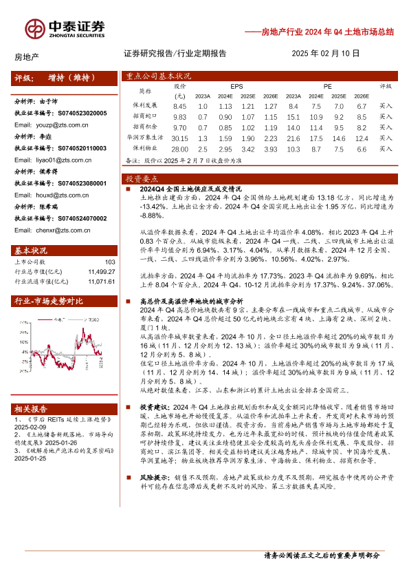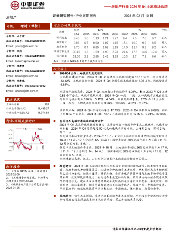 【中泰证券】【20250210】房地产行业2024年Q4土地市场总结:政策支持,销售回暖,土地市场拐点出现-10页